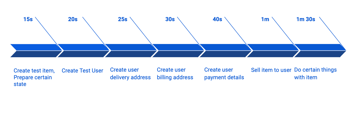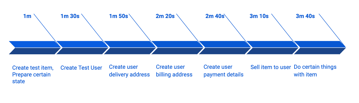 If we check our test scenario again, we can clearly see that the actual validation of our test scenario happens only after the third minute! And everything we have up until then it’s just creating preconditions. What we actually want to test is: “User can do certain action with item purchased on our platform”. We should not care HOW we got this item, we should have another test, testing that user should be able to purchase. This just creates dependency for us that makes our tests: