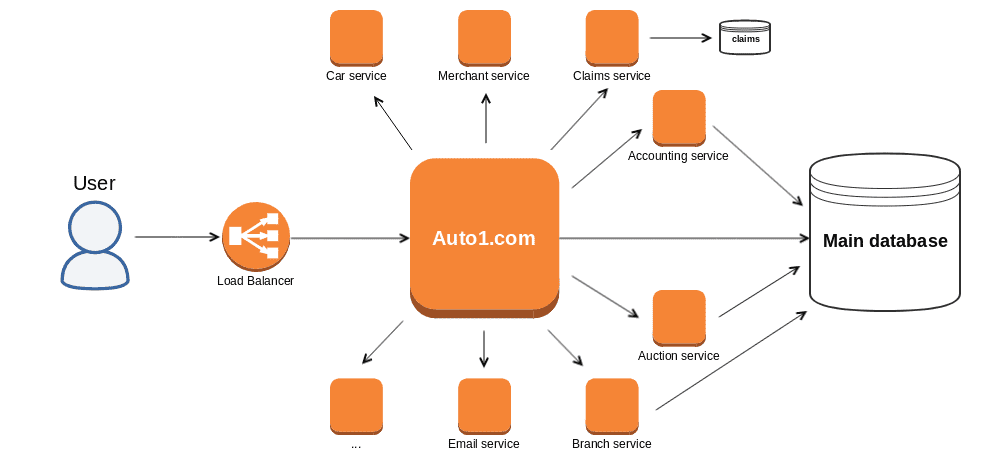 These services mostly used the same database as the existing applications and served as a business logic layer for them. So for example when user visited auto1.com/my-orders, he still did request to the monolith application. The application, in turn, performed a request to the needed microservices to get all the necessary information in order to respond properly
