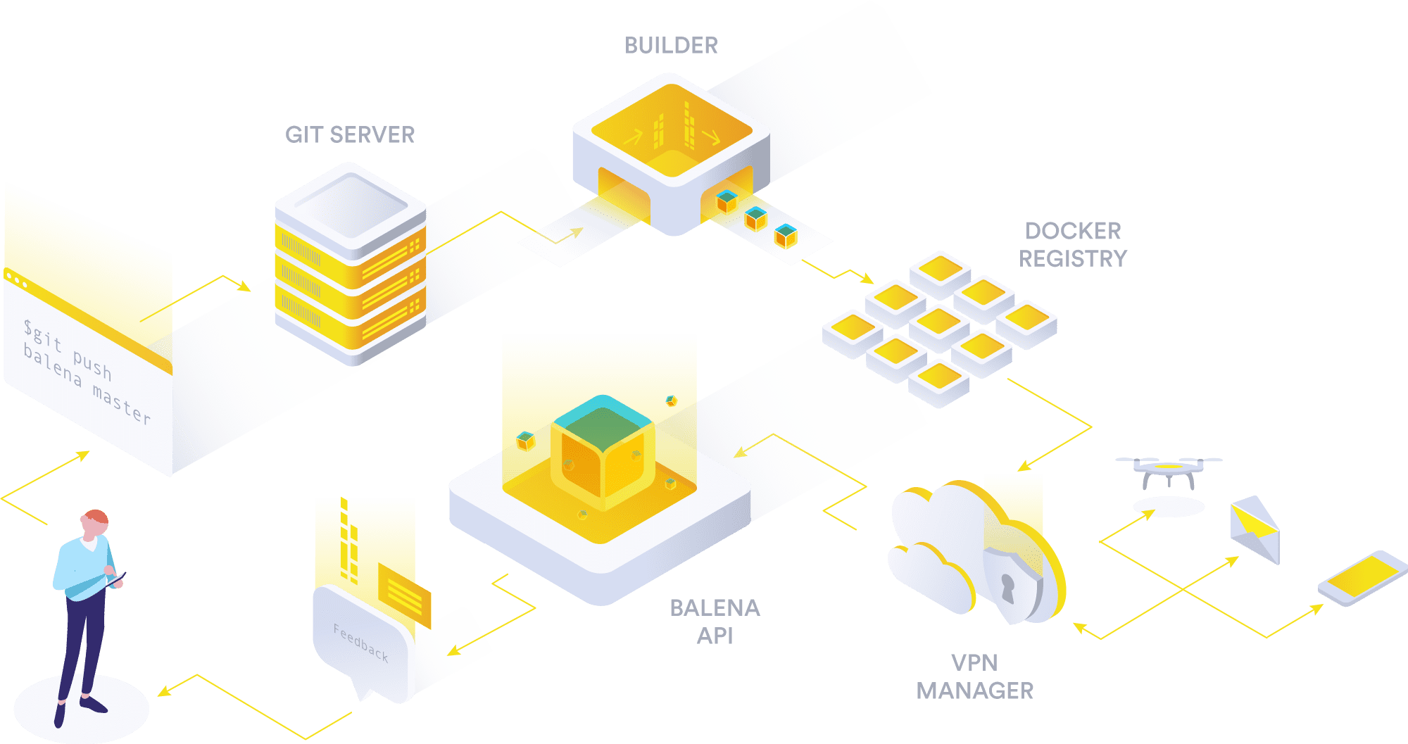 Balena provides customized operating system that runs supervisor whose task is to get updates of your Docker images pushed to balena cloud, pull them locally and restart container with new changes.
