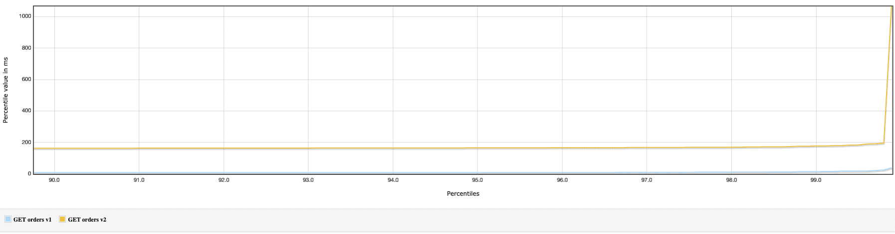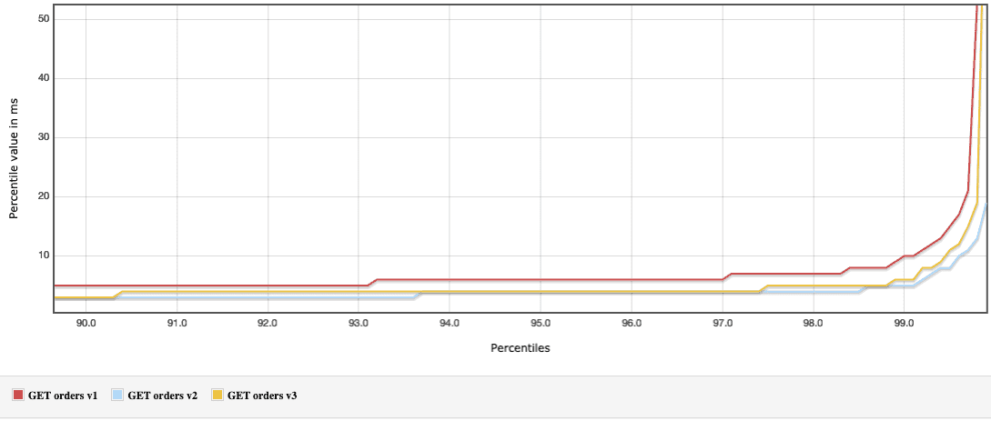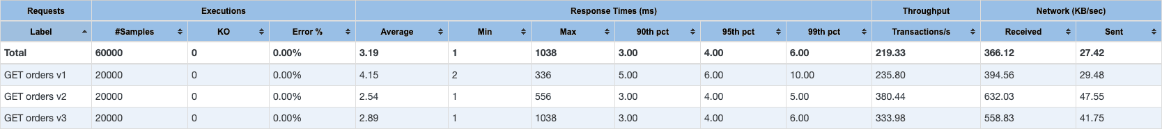 The requests are run in strictly defined sequence, fetching the orders one by one. There’s a prewarming phase which issues 100 requests and then a profiling phase with 20k of requests.