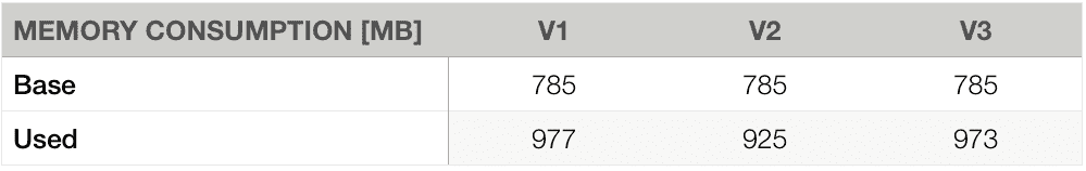 We can notice also a lower memory consumption on the V2 - it used 52 MB (49 MiB) less memory than V1 (noted the initial app’s memory usage which is 785 MB):