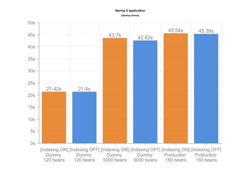 As the above results have consistently shown, there was no improvement or even insignificant worsening (which will be a subject of our analysis in a separate article) of the bootstrapping time of the Spring applications, regardless of the number of candidate beans present, when using the pre-generated candidate component index. This was expected, as explained in the opening section, the conditions for which this feature was designed (slow or expensive IO operations) are simply not met in our case. One more important factor to consider here, is that a great deal of the beans in our Spring applications, is created using bean definition factory methods, which are not subject to the component classpath scanning, thus are not impacted by this feature.